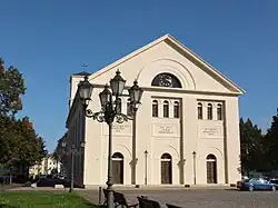 Der Zugang befindet sich auf der Westseite, die von einem großen Dreiecksgiebel überspannt wird. Durch Lisenen wird die Westfassade in drei gleich große Bereiche unterteilt. Jeder dieser Bereiche trägt eine große Inschrift: „IM KRIEGESDRANG ZERSTÖRT 1813“ „MIT GOTT DURCH KÖNIGSHULD“ „IM FRIEDEN HERGESTELLT 1824“.