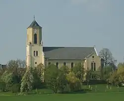 Die Grundsteinlegung war am 28. Mai 1863, und am 5. November 1865 wurde die Kirche mit dem ersten Gottesdienst eingeweiht. Sie bildet im Grundriss ein Rechteck, nach Osten mit vorspringendem Chor, westlich mit dem weit sichtbaren Turm.[1]