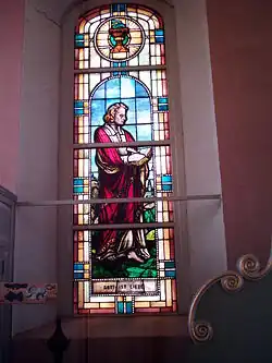 In die östliche Wand sind seitlich der Altar-Kanzel-Konstruktion zwei buntverglaste Fenster eingelassen, die am zweiten Januar 1936 durch den Malermeister Otto Holtkamp fertiggestellt wurden. Das linke zeigt in farbenprächtiger Ausführung den noch bartlosen Evangelisten Johannes von der Seite, bekleidet mit einem roten Mantel, wie er mit einer Schreibfeder in die Bibel schreibt, die er in seiner linken Hand hält. Zu seinen nackten Füßen befindet sich die Inschrift „Gott ist Liebe“ aus dem ersten Johannesbrief, Vers 16 Kapitel 4. Über Johannes befindet sich im Vordergrund eines Kreuzes sein Attribut: ein Kelch, aus dem sich eine Schlange erhebt.