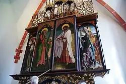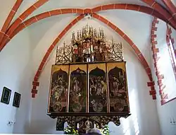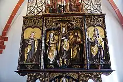 In der Predella ist hinter Schleierwerk ein Relief mit einer Darstellung der Auferstehung untergebracht. Im Mittelschrein sind Schnitzfiguren der von zwei Engeln getragenen Mondsichelmadonna zu finden, die von einer Darstellung der Heiligen Dreifaltigkeit bekrönt und von Figuren der Heiligen Nikolaus und Katharina flankiert wird. In den Flügeln sind die Heiligen Erasmus und Barbara dargestellt. Beachtenswert sind die fein gearbeiteten Astwerkbaldachine sowie der meisterhaft dargestellte Faltenwurf und die individuelle Gestaltung der Gesichtszüge der Figuren.