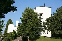 Die katholische Kirche wurde auf schmalem Baugrund anstelle des Vorgängerbaus errichtet. Dieser hatte während der ersten Phase des Kirchenneubaus noch daneben gestanden, wurde dann aber nach der Errichtung des Saals abgetragen. Neben dem engen Bauareal war für die Formgebung auch „die dörfliche Bebauung und der schöne, dominierende Bau der reformierten Kirche“ bestimmend, wie Architekt Walter Moser schreibt.[6]