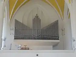 Der moderne Bau wurde zurückhaltend von dem Bildhauer Curt Porzky aus Altötting ausgestattet. Zentrales Gestaltungselement ist eine Kreuzigungsgruppe – der sterbende Christus flankiert von seiner Mutter Maria und seinem Lieblingsjünger Johannes –, die seit der Renovierung in den Jahren 2013 und 2014 durch eine vergoldete Rückwand noch stärker zur Geltung kommt. Vor dieser ist der Tabernakel platziert. Der Ambo und der Volksaltar sind dagegen aus dem westlichen Kreuzesarm deutlich nach vorne gerückt und befinden sich beinahe in der Mitte des Kirchenraumes. In den drei übrigen Armen befinden sich die Kirchenbänke für die Gemeinde. Der östliche Kreuzesarm wird von der Orgelempore überdeckt, darunter der Übergang zur alten Kirche. Hier befindet sich auch ein moderner Taufstein.[4]