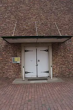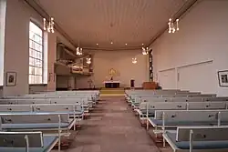 Als Portal dient eine weiße und an der Westwand befindliche sowie zweiflügelige Tür, über der zur Hervorhebung ein baldachinartiges Vordach angebracht ist. Direkt am Eingangsbereich befindet sich im Inneren der Kirche eine Empore. Der schlichte Kirchenraum hat eine flache Holzdecke. Die konkave Altarwand soll einen sublimen Eindruck erzeugen.[4] Über dem Altar ist eine Plastik des Bremer Bildhauers Günther Colberg aufgehängt, die Christus die Welt segend und von dieser verehrt werdend zeigt. Das Buntglasfenster hat Darstellungen aus dem Leben Jesu als Motive.[3] Der Taufstein befindet sich nördlich, bzw. links des Altars befindet sich der um ein paar Stufen abgesenkte Taufplatz samt Taufspein.[4] Über dem Taufplatz befindet sich eine weitere Empore mit der 1969 vom Wilhelmshavener Orgelbauer Alfred Führer gefertigten Hauptorgel.[3] Diese hat 18 Register auf zwei Manualen und Pedal. Daneben hat die Kirche eine Chororgel.