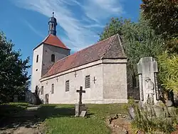 Die Kirche geht in ihrer Grundform auf ein romanisches Bauwerk zurück, das im 15. oder 16. Jahrhundert um einen dreiseitigen Chor erweitert wurde. Bereits 1506[1] bestand hier eine eigene Pfarrstelle. 1627 wurden das Innere erneuert und neue Emporen eingebaut. Kurz danach, 1631, wurde die Kirche durch kaiserliche Truppen geplündert und die Kirchenfenster wurden zerstört. Bis 1701/02 war der Wiederaufbau abgeschlossen, auch eine neue Innenausstattung wurde gefertigt. 2010–2012 wurde die Kirche restauriert.
