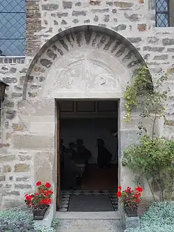 Der Eingang der Kirche befindet sich an der Südseite. Im Südportal hat sich ein verwittertes Tympanon mit Rosetten aus dem späten 12. Jahrhundert erhalten. Westlich des Eingangs befindet sich das Grabmal der Familie Hildebrand, das 1875 entstand. Die Familie war seit 1858 Eigentümer der Böllberger Mühle und damit auch, bis 1945, Patron der Kirche.[D 6]