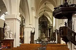Die Kirche besitzt ein kleines Bild der Muttergottes mit dem schlafenden Kind, Original oder Kopie nach Peter Paul Rubens.[1] Bedingt durch Zerstörungen und Umgestaltungen stammt die übrige Ausstattung zu großen Teilen aus dem 19. Jahrhundert, darunter der neugotische Schrein der Märtyrer von Gorkum, deren Reliquien aus der nahe gelegenen Franziskanerkirche nach deren Aufhebung in der Französischen Revolution nach St. Nikolaus kamen. Das große Fenster Mariä Himmelfahrt in der Portalfassade schuf Guy Chabrol 1956.[2]
