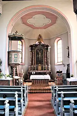 - Hochaltar (1. viertel 18. Jh.) mit einem Ölbild: Kreuzigung (1655 signiert Rambold). Altarbekrönung: Immakulata im Strahlenkranz (Holz, Mitte 18. Jh. der Werkstatt von Martin Biterich zugeschrieben)