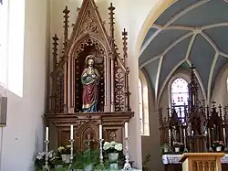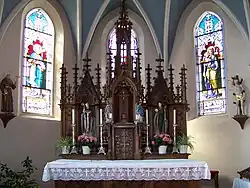 Die Altäre sind mit Fialen, Giebeln, Türmchen und Kreuzblumen bekrönt. Der neugotische Hochaltar ist in drei Schreine gegliedert. Über dem Tabernakel steht das Kreuz, flankiert von zwei Engeln; im linken Schrein die Figur des Kirchenpatrons St. Nikolaus von Myrha mit drei Äpfeln auf einem Buch. Im rechten Schrein sieht man die Figur des hl. Bonifatius mit seinem Attribut der Axt. Die Seitenaltäre Herz-Jesu und Herz-Maria sind dem Hochaltar ähnlich und mit Fialen und seitlichen Blumenornamenten in durchbrochenem Schnitzwerk ausgestattet. Unter dem Chorbogen ist noch die zweiteilige Kommunionbank mit Dreipass-Ornamenten erhalten.
