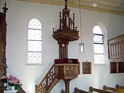 An der Ostwand des Langhauses befindet sich die sechseckige Kanzel. Die Felder und die Treppe sind mit Drei- und Vierpasselementen und reichlich Rankenwerk verziert. Der Schalldeckel wiederholt die Grundform der Kanzel und trägt einen hohen Aufbau mit Fialen und Kreuzblumen.