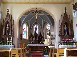 Der Chor ist mit einem sternförmig figurierten Netzgewölbe überzogen. Die gekehlten Rippen entspringen halbrunden Spitzkonsolen und vereinigen sich im Gewölbescheitel an runden Schlusssteinen. Bunte Glasfenster mit Motiven von St. Nikolaus und St. Josef tauchen den Chor in gedämpftes Licht. Das Schiff ist flach mit einer Holzdecke gedeckt. Die einheitliche, neugotische Einrichtung stammt aus der Bauzeit der Kirche.