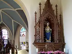Beim rechten Seitenaltar steht das aus hellem Sandstein gefertigte Taufbecken. Vom quadratischen Sockel geht der profilierte Schaft in ein Achteck über, auf den die mit Ornamenten verzierte achteckige Schale folgt. Die Abdeckung besteht aus einer achteckigen Pyramide aus Holz mit geschnitzten gotischen Ornamenten und einer Kreuzblume.