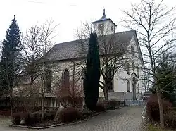 Die spätklassizistische Saalkirche wurde 1843 erbaut. Sie besteht aus einem Langhaus, einem eingezogenen, gerade geschlossenen Chor im Süden und einem Kirchturm an der Westwand des Langhauses, dessen oberstes Geschoss die Turmuhr beherbergt. Das Portal befindet sich in der Fassade im Norden.