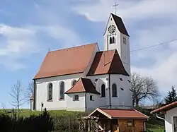 Die Saalkirche wurde am Ende des 15. Jahrhunderts anstelle einer 1437 erwähnten Kapelle erbaut und um 1761 umgestaltet. Sie besteht aus einem Langhaus, einem eingezogenen, dreiseitig geschlossenen, von Strebepfeilern gestützten Chor im Osten, einem Chorflankenturm an der Nordwand und der Sakristei an der Südwand des Chors. Der Chorflankenturm ist quer mit einem Satteldach bedeckt. In den Giebeln hängen die Zifferblätter der Turmuhr. Das oberste Geschoss beherbergt hinter den als Biforien gestalteten Klangarkaden den Glockenstuhl. Der Innenraum des Langhauses ist mit einer Flachdecke überspannt, der des Chors mit einem Stichkappengewölbe. Der Stuck wurde 1761 von Joseph Fischer eingebracht. Zur gleichen Zeit entstanden die Fresken von Anton Joseph Walch. Im Hochaltar von 1910, der von den Statuen der Barbara von Nikomedien und der Katharina von Alexandrien flankiert wird, befindet sich eine Pietà aus dem späten 17. Jahrhundert, die Johann Pöllandt zugeschrieben wird. Auf der Brüstung der Empore sind Fides, Spes und Caritas dargestellt.