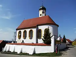 Über die frühere Kirche ist nichts bekannt. Als sicher gilt, dass beim Neubau 1730 Baumaterial der Vorgängerkirche verwendet wurde. Die Kirche wurde vom Kloster Rot an der Rot unter dem Abt Hermann Vogler erbaut. Zumindest das untere spätmittelalterliche Turmgeschoss wurde wiederverwendet.