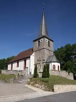 Die Nikolauskirche, eine Filialkirche der Pfarrei Seßlach, stammt im Kern aus dem 14. und 15. Jahrhundert.[1] Von der spätmittelalterlichen Chorturmanlage sind noch die beiden unteren Turmgeschosse erhalten. Das Glockengeschoss stammt aus dem späteren 15. Jahrhundert. 1614 wurde die Kirche mit dem heutigen Patrozinium urkundlich genannt. Das Langhaus wurde im Dreißigjährigen Krieg zerstört. Zwischen 1710 und 1720 folgte der Neubau des Kirchenschiffes, wohl durch den Seßlacher Maurermeister Hanns Michael Schmitt. 1895 ließ die Gemeinde den Anbau der Sakristei im neugotischen Stil errichten. Eine Innenrenovierung wurde 1961 durchgeführt.[2]