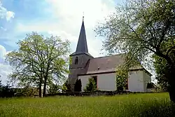 Ein einspringender, runder Chorbogen mit profilierten Kämpfern verbindet den Chor mit dem Langhaus. Das Langhaus ist ein Saalbau mit drei Fensterachsen, der von einer verputzen Flachdecke über einer kräftig profilierten Gesimskehle überspannt wird. Die Decke hat einen umlaufenden doppelten Stuckrahmen, dessen Profile in den vier Achsen in Halbkreisen verschlungen sind. Im Spiegel befindet sich außerdem ein größerer Mittelrahmen an den vorne und hinten zwei kleinere Rahmen in Herzform anschließen. Die Nordseite des Langhauses hat zwei hohe Rechteckfenster in stichbogiger Laibung, die Südseite hat ebenfalls zwei gleich gestaltete Fenster und zusätzlich in der Mittelachse über dem geschlossenen Seiteneingang ein verkürztes rechteckiges Fenster. Der Zugang befindet sich in der Westseite, über dem die hölzerne Orgelempore angeordnet ist. Die Empore stammt wohl aus dem späten 18. Jahrhundert. Sie ruht auf zwei gusseisernen Säulen aus dem späten 19. Jahrhundert. Die schlichte, gefelderte Rahmenbrüstung ist im Mittelteil dreiseitig vorgezogen. Den Zugang bildet eine abgewinkelte Podesttreppe in der Nordwestecke. Die Fassade besteht aus verputzten Sandsteinquadern und Brockenmauerwerk. Profilierte und geohrte Rahmungen an Türen und Fenstern aus Sandstein gliedern die Fassade. Den oberen Abschluss bildet ein profiliertes hölzernes Traufgesims unter einem abgewalmten Satteldach mit einer Ziegeldeckung.[2]