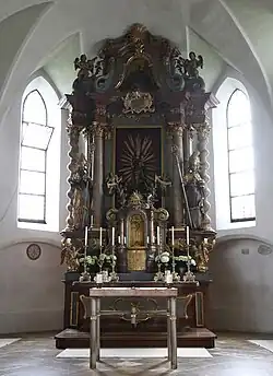 Der Hochaltar wurde 1758/59 aufgestellt. Er wird von den Skulpturen des Nikolaus von Myra und des Rupert von Salzburg flankiert. Im Altarretabel ist in einem rechteckigen Rahmen eine gekrönte Strahlenkranzmadonna mit Jesuskind und Zepter. In einer Gruppe nach oben größerer werdender Engelskulpturen halten zwei Engel Spruchbänder mit den Anrufen „Du Zuflucht der Sünder“ und „Du Heil der Kranken“. Zwischen den Engeln unmittelbar über dem Expositorium des Tabernakels ist ebenfalls in einem Strahlenkranz und von einem Dreizack als Symbol der Heiligen Dreifaltigkeit umschlossen das Auge der Vorsehung dargestellt, in einem Gemälde im Altarauszug Gott der Vater mit zum Segen erhobener rechter Hand, den Blick auf eine Taube gerichtet, das Symbol des Heiligen Geistes.