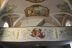 Die Deckenmalereien stammen von 1750 und wurden im Stil von Johann Anwander ausgeführt. Sie stellen die Verklärung des heiligen Nikolaus dar, die Krönung des Heiligen durch die Dreifaltigkeit und die Taufe eines Fürsten durch den heiligen Nikolaus, der einen Götzen vom Sockel stoßen lässt. Die Zwickel sind mit Grisaillen mit Szenen aus dem Leben des heiligen Nikolaus gestaltet. Auf der Emporenbrüstung ist die heiligen Cäcilia dargestellt, die auf der Orgel spielt.