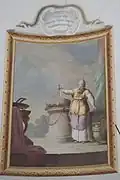 Die Malereien und Fresken im Inneren stammen von Johann Joseph Anton Huber. Der Altar wird um 1730 datiert, über der Predella ist ein gestufter Aufbau mit Gemälden von Johannes Rottenhammer zu sehen und darüber befindet sich eine geschnitzte Kreuzigungsgruppe, die Andreas Hainz zugeschrieben wird.