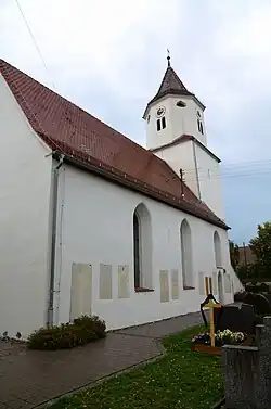 Die unteren Geschosse des im Kern gotischen Chorturms sind um 1300 auf quadratischem Grundriss im Osten des Langhauses entstanden. Nach seinem Einsturz wurde er 1653 erneuert. Dabei erhielt er ein achteckiges Obergeschoss aus verputztem Holzfachwerk, das die Turmuhr und den Glockenstuhl beherbergt. Darauf sitzt ein achtseitiges Zeltdach. Zeitgleich wurde die Sakristei an der Nordwand des Chorturms angebaut.