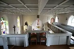 Der Innenraum des Langhauses ist mit einer Kassettendecke überspannt, der in das Erdgeschoss des Chorturms eingebaute Chor mit einem Kreuzrippengewölbe. Über dem Chorbogen befindet sich das Oettinger Wappen.