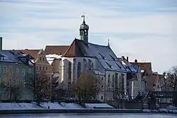 Auffallend ist der schlanke hohe Chor, der mit durchgehender Sohlbank, schlanken, hohen Fenstern und schlichtem Maßwerk große Ähnlichkeit mit dem Chor der etwas früher entstandenen Dominikanerkirche zeigt, wo auch identische Steinmetzzeichen gefunden wurden. Die heute im Innenraum der Kirche sichtbaren Kellergewölbe am Fuß des Chores wurden nach Ergebnissen von noch nicht endgültig abgeschlossenen Bauforschungen als Bestandteile der Erdgeschoss-Zone der ehemals südlich an die Kirche anschließenden profanen Vorgängerbauten eines Frauenstiftes erkannt.