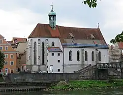 1307 hatten die beiden reichen Regensburger Patrizier Friedrich Auer und Karl Prager die sog. „neue“ oder „reiche“ Spitalstiftung für 12 Pfründnerinnen gegründet mit Spital und Kirche. Bei der Stiftung handelte es sich um die erste rein bürgerliche Stiftung, die sich deutlich abgrenzte von der Katharinenspitalstiftung, die von Bürgern und Bischof gemeinsam verwaltet wurde. Die Wappen der Stifter sind an den Strebepfeilern der Chornordseite, zur Straßenseite und zur Donau weithin sichtbar. Nach dem Aussterben der Prager 1307 übernahmen die Gumprecht deren Stiftungsanteile und übernahmen Spitalpflege und Verwaltung des Spitals. Das „Reiche Spital“ diente zur Versorgung frommer Frauen aus den Familien der Stifter. Das Wappen der Gumprecht befindet sich im Innern der Kirche am Schlussstein im Chorjoch. Nach dem Aussterben der Auer 1483 beanspruchte der Rat der Stadt die Patronatsrechte. Erst nach einem jahrelangen Rechtsstreit wurden diese Rechte dem Rat der Stadt 1514 zugesprochen. Deshalb konnte 1537 im Vorfeld der Reformation die Spitalpflege an das wenige Jahre zuvor neu gegründete reichsstädtische Almosenamt übertragen werden. Das Wappen der Stadt befindet sich am Schlussstein im Chorschluss. Rechtsnachfolger des Almosenamtes ist heute die Evangelische Wohltätigkeisstiftung, die das Spital, das heute als Studentenheim genutzt wird, verwaltet.[1]