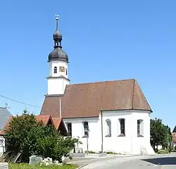 Die gotische Saalkirche wurde 1414 erbaut. Sie besteht aus einem Langhaus und einem eingezogenen, dreiseitig geschlossenen Chor im Osten. Im Westen des Langhauses befindet sich ein Dachturm, der sich über dem Satteldach erhebt. Er wurde mit einem achteckigen Geschoss aufgestockt, das die Turmuhr und den Glockenstuhl beherbergt, und mit einer Zwiebelhaube bedeckt, auf der eine offene Laterne sitzt, in der eine kleine Kirchenglocke hängt.