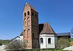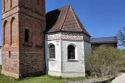 Der südseitig angebaute Chorflankenturm ist spätgotisch und dürfte daher zeitgleich mit dem Chor entstanden sein. Oberhalb zweier von gefasten Spitzbogenblenden verzierter Geschosse befindet sich der Glockenstuhl, der hinter doppelt gefasten, spitzbogigen Schallöffnungen zwei Glocken aus der Erbauungszeit der Kirche enthält. Diese müssen noch heute von Hand geläutet werden. Den oberen Abschluss bildet ein einfaches Satteldach. Der Turm ist der einzige unverputzte Gebäudeteil; hier ist das gotische Backsteinmauerwerk sichtbar, während Langhaus und Chor mit einer weißen Kalkschlämme überzogen sind. Eine Besonderheit ist die Schiefstellung des Turmes; er ist um rund 60 Zentimeter nach Süden geneigt. Im Turmuntergeschoss ist die Sakristei untergebracht; in rund drei Metern Höhe, also ein Geschoss oberhalb der Sakristei, befindet sich auf der Turmostseite eine Tür, über die eine Betretung der oberen Geschosse möglich ist.[1][3][4]