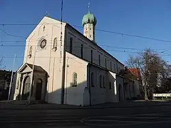 Die Basilika wurde 1867 im spätklassizistischen Baustil von Karl Friedrich Andreas Klumpp dem Jüngeren[1] erbaut. Ihr Langhaus besteht aus einem Mittelschiff und zwei Seitenschiffen. Im Osten des Mittelschiffs befindet sich der eingezogene, halbrund geschlossene Chor. An seiner Nordwand ist der Chorflankenturm, an seiner Südwand die Sakristei angebaut. Der Chorflankenturm wurde, nachdem er sich zu neigen begann, 1929 nach einem Entwurf von Albert Kirchmayer neu aufgebaut. Er erhielt achteckige Obergeschosse und wurde mit einer Zwiebelhaube bedeckt. Nach der Zerstörung im Zweiten Weltkrieg wurde sie vereinfacht wieder aufgebaut.