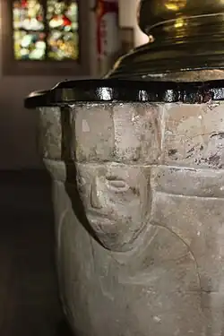 Der romanische Taufstein aus Namurer Blaustein stammt aus dem 12. Jahrhundert und ist damit das älteste religiöse Zeugnis in Glehn (der messingfarbene Deckel ist eine spätere Zutat). Er ist in rustikaler Tiegelform ausgeführt, ruht auf einer kräftigen Mittelstütze und wird durch ein Rundbogenfries am oberen Rand verziert.