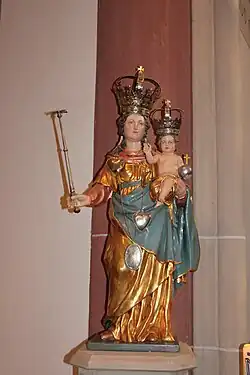 Das Alter der im Altarraum aufgestellten „Glehner Madonna“[10] lässt sich nicht exakt bestimmen. Erstmals wird sie 1651 als beliebtes Pilgerziel in der Pfarrchronik erwähnt. Die silbernen Kronen und das Zepter sind im Jahr 1700 angefertigt worden, da die ursprünglichen ein Jahr zuvor bei einem Einbruch entwendet worden waren.