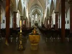 Der Hauptturm wird flankiert durch zwei Eingangshallen, die den Zugang zu den Seitenschiffen ermöglichen. Die nördliche dieser Hallen ist als Totengedächtniskapelle zu Ehren der in den beiden Weltkriegen getöteten Einwohner gestaltet.