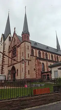 Deutlich geprägt von der Industriellen Revolution des 19. Jahrhunderts und ihren zahlreichen neuen bautechnischen und handwerklichen Möglichkeiten entstand ab April 1896 in der stark anwachsenden Pfarrgemeinde nach Plänen des Frankfurter Architekten Joseph Röder, an der Südostecke des alten Glockenturms angesetzt, ein modernes, neugotisches Gotteshaus in kürzester Zeit und stilistisch aus einem Guss. Entsprechend wurde auch das Kircheninnere neogotisch mit rot-blau-goldener Bemalung ausgestattet. Die alte Orgel von 1861 wurde in den Neubau übernommen und durch die Orgelbauwerkstatt Körfer (Gau-Algesheim) erweitert.[2]