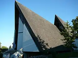 Die Kirche St. Paulus erinnert in ihrer architektonischen Grundkonzeption an ein Zelt. Dazu schreibt der Architekt Justus Dahinden: «Der heilige Paulus war ein Zeltmacher; so soll auch seine Kirche etwas vom Charakter der Improvisation zeigen: sie ist nicht endgültige Wohnung Gottes, sondern nur ein ‹Campingplatz› der christlichen Gemeinschaft, der zur ewigen Wohnung hinführen soll.»[11] Vom Ortszentrum her gesehen, befindet sich die Kirche an einem Hang. Als Kontrapunkt zur Hanglage erheben sich die vier Firstlinien der Kirche sowie der Annexbauten über der Buchserstrasse und bilden einen kreuzförmigen Grundriss.[12] Die beiden Glocken der Kirche befinden sich nicht in einem separaten Kirchturm, sondern hängen frei am First des Chores. Von der Buchserstrasse aus gelangt man über eine Treppe zur Kirche, deren christliche Prägung durch ein monumentales Fenster in Kreuzform, das in die Betonwand eingelassen wurde, angezeigt wird. Um ins Kircheninnere zu gelangen, betritt der Gläubige einen höhlenartigen Vorraum, «wo sich der Kirchgänger im Durchschreiten loslöst von der lärmigen profanen Umwelt und sich sukzessive einführt in die Feierlichkeit des kirchlichen Schweigens».[13]