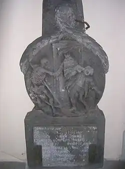 Auf einem Grabstein ist die Todesursache des 1783 verstorbenen Jungen Andreas Kühn, der als Elfjähriger von einer Glocke erschlagen wurde, in naiver Weise dargestellt.[2]