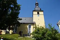 Die Saalkirche wurde 1616–1620 nach Norden, in Richtung des Friedhofs, erweitert. An den im Kern spätromanischen, später mit einer Welschen Haube bedeckten Chorturm wurde 1709 das Langhaus mit dreiseitigem Schluss nach Westen angebaut. Zur Kirchenausstattung gehören der 1671 gebaute Altar und die mit Intarsien verzierte Kanzel, die um 1620 aufgestellt wurde. Bei der Renovierung von 1956 wurden die Emporen im Süden und die obere der beiden Emporen im Norden beseitigt. Im Chor, d. h. dem Erdgeschoss des Chorturms, der mit einem Tonnengewölbe überspannt ist, wurden Wandmalereien aus dem 15. Jahrhundert freigelegt. Die Orgel mit 11 Registern, einem Manual und einem Pedal wurde 1826 von den beiden Söhnen von Friedrich Heidenreich gebaut.[1]