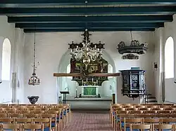 Zur Kirchenausstattung gehört ein um 1480/1500 gebauter gotischer Flügelaltar mit zwei beweglichen Flügelpaaren, in dessen Mittelschrein eine geschnitzte figurenreiche Kreuzigungsdarstellung unter Maßwerkbaldachinen zu sehen ist. In der Mitte kniet Maria Magdalena unter dem Kreuz. Zwei Engel mit Kelchen schweben neben dem sterbenden Jesus. Die Seele des guten Schächers wird von einem Engel in Empfang genommen, die des anderen von einem Teufel. In den Flügeln befinden sich als Schnitzreliefs vier Szenen der Weihnachtsgeschichte. Die Predella wurde in der Barockzeit 1698 mit einer Abendmahlsdarstellung bemalt, wie aus der Stifterinschrift hervorgeht. Aus dieser Zeit stammt auch die neu Fassung der meisten Holzelemente. Das Altarretabel ist von einer barocken Schnitzfigur des auferstandenen Jesus Christus zwischen[1] Akanthusornamenten bekrönt. Die Innen- und Außenseiten der Flügel zeigen schlecht erhaltene Gemälde von etwa 1500 mit der Passionsgeschichte, auf der Außenseite ergänzt durch eine Darstellung des Jüngsten Gerichts. Wie die Inschrift unter dem Mittelbild mitteilt, wurde das Retabel 1842 „der Kirche zur Zierde und der Gemeinde zur Erbauung“ renoviert. Bei der Restaurierung 1999 kam die zwischenzeitlich ins Museum nach Husum abgegebenen Gemäldeflügel zurück. Der Flügelaltar kann nun wieder gewandelt werden.[4][2]