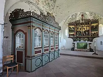 Der frühere Beichtstuhl, der sich auf der linken Seite des Chorraums befindet, wurde 1758 gefertigt und trägt über dem Fensterausschnitt eine Inschrift aus der Bibel. Er ist ein Zeugnis der noch lange nachwirkenden katholischen Traditionen auf Eiderstedt.[2]