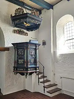 Die Kanzel der Kirche, die 1571 im Renaissancestil gefertigt wurde, zeigt auf den Brüstungsfeldern des sechseckigen Korbes die Namen und Lebensdaten mehrerer Pastoren. An der Wand neben der Kanzel hängt eine Kanzeluhr. Der dazugehörige Schalldeckel wurde 1750 im Barockstil überformt und ist reich verziert.[2][4]