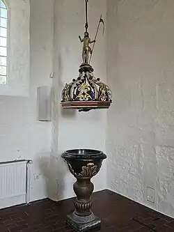 Das Taufbecken aus Granit stammt aus dem Jahr 1728 und wird von einem barocken Deckel gekrönt, auf dem eine geschnitzte Figur des auferstandenen Christus mit der Siegesfahne thront.[2]