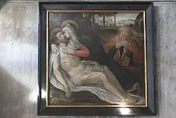 - Neben dem Eingang hängt ein Gemälde von 1637, auf dem eine Pietà dargestellt ist. Im Hintergrund erkennt man den reuigen Apostel Petrus, den der Hahn daran erinnert, dass er Jesus verleugnet hat.
