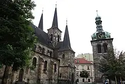 Um das Jahr 1200 brachte der mährische Markgraf Vladislav Heinrich den Orden der deutschen Ritter hierher, der hier seinen Spital und gleichzeitig seinen Sitz gründete. Nach dem Tod seines Ehemannes, Ottokar I. Přemysl, entschied sich hier Konstanze von Ungarn ein Kloster der Zisterzienser zu gründen, weshalb sie die Kirche, das Spital und die umliegenden Ländereien erwarb. Der Orden der deutschen Ritter sollte zu der nahen Kirche des heiligen Benedikts umsiedeln. Am Ende jedoch gründete die Königin ein Kloster der Zisterzienser bei Tišnov. Die Kirche, zusammen mit weiterem von den deutschen Rittern abgekauftem Vermögen, schenkte sie dem Spital des heiligen Franziskus, das im selben Jahr ihre Tochter Agnes gründete. Aus der ursprünglichen Brüderschaft des Spitals wurde allmählich ein neuer böhmischer ritterlicher Kirchenorden der Kreuzherren mit dem Roten Stern, der hier nach wie vor Gottesdienste hält. Nach der Flut im Jahre 1280 entstand an der Kirche ein Massengrab, auf dessen Stelle später ein regulärer Friedhof entstanden ist. Am Anfang des 14. Jahrhunderts wurde an der Kirche eine Pfarrschule gebaut.