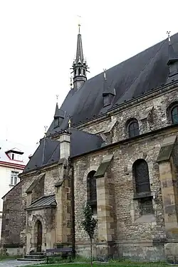 Das lang gezogene Presbyterium mit drei rechteckigen Kreuzfeldern hat einen dreiseitigen Abschluss, das längliche Schiff besteht aus vier rechteckigen Teilen. Ihre Südwand ist eine Fortsetzung der südlichen Wand des Presbyteriums. Das niedrigere Seitenschiff im Norden hatte ursprünglich ebenso vier Kreuzfelder, das östliche einen quadratischen Grundriss, das zweite und dritte Teil ist leicht länglich. Das Presbyterium verstärken nicht abgestufte, oben mit einem Pult abschließende Stützpfleiler. Die gebrochenen zweiteiligen Fenster haben eine einfach gerinnte Laibung. Die einfachen Kreisungen mit flammenartigen Motiven sind aus dem späten 14. Jahrhundert.