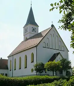 Die giebelständige, nach Südwesten ausgerichtete, neugotische Saalkirche wurde 1905/06 erbaut und 1998 renoviert. Sie besteht aus einem mit einem Satteldach bedeckten Langhaus, einem eingezogenen, dreiseitig geschlossenen, von gestuften Strebepfeilern gestützten Chor im Südwesten, einem mit einem spitzen Helm bedeckten Chorflankenturm an dessen Nordwestwand und der mit einem Walmdach bedeckten Sakristei an dessen Südwestwand. An der Fassade im Nordosten befindet sich ein Anbau, der ein Vestibül hinter dem Portal beherbergt. Der Giebel darüber ist mit Blenden verziert.