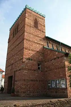 Die expressionistische Basilika aus rotem Sandstein wurde 1922/23 nach einem Entwurf von Dominikus Böhm und Martin Weber aus rotem Sandstein erbaut. Die Wände sind mit Ziegelbändern gegliedert. Der querrechteckige Kirchturm in Breite des Mittelschiffs ist mit Zinnen bekrönt, die einen kleinen Dachreiter umschließen. Ausgestaltet wurde die Kirche mit großformatigen Fresken von Reinhold Ewald.