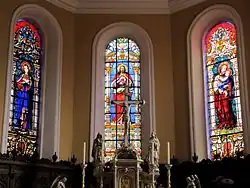 Die Fenster im Chor wurden 1877 von Burckhardt & Sohn aus München geschaffen. Sie zeigen links die Gottesmutter, in der Mitte Christus und rechts Joseph.