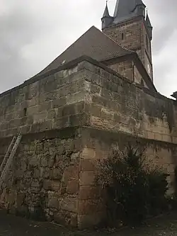 Die Tradition als Wehrkirche wird auch durch die bis zu 5,50 Meter hohe, mittelalterliche Wehrmauer bezeugt. Diese Höhe hatte sie zur abfallenden Westseite hin (Talrand der Regnitz), an der Ostseite war sie knapp drei Meter hoch (etwa 2,70 Meter über Friedhofsniveau). Der Friedhof wurde von der Basis der Mauer bis zur Höhe der Eingänge mit eingebrachtem Boden befüllt. Die alte Ringmauer bestand – wie in vergleichbaren Fällen des Nürnberger Umlandes – außen aus gequaderten Sandsteinen, innen aus vermörtelten Bruchsteinen. Sie war mit beiden Lagen etwa einen Meter dick und bot somit Schutz vor Kanonenkugeln und schweren Geschützen. Von Westen her ist das Ensemble mit Kirche und Mauer auf einem Kupferstich von C. M. Roth "Bruck Landalmoßamt" (1760) abgebildet.[3] Der Ostteil der Wehrmauer wurde 1848 zusammen mit dem Torhaus abgebrochen. An den drei anderen Seiten wurde die innere Bruchsteinmauer 1895 bis auf Bodenniveau des Friedhofs abgetragen, in dieser Höhe ist sie bis heute erhalten. Die äußere Mauer aus Sandsteinquadern steht heute in der ursprünglichen Höhe nur noch an der Westseite, wobei sie von außen größtenteils durch angebaute neue Gebäude verdeckt wird. Im oberen Teil wurde sie saniert und teilweise erneuert.