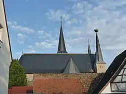 Die Kirche wurde in Nord-Süd-Richtung erstellt, wobei Teile der alten Kirche (Chor mit Sakristei und Turm) erhalten blieben und in den Kirchenneubau eingegliedert wurden. Es entstand eine dreischiffige Kirche mit einer auffälligen Doppelturmfassade.