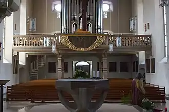 - Über dem Zelebrationsaltar hängt ein spätgotisches Kruzifix, das der Werkstatt von Tilman Riemenschneider zugeschrieben wird.